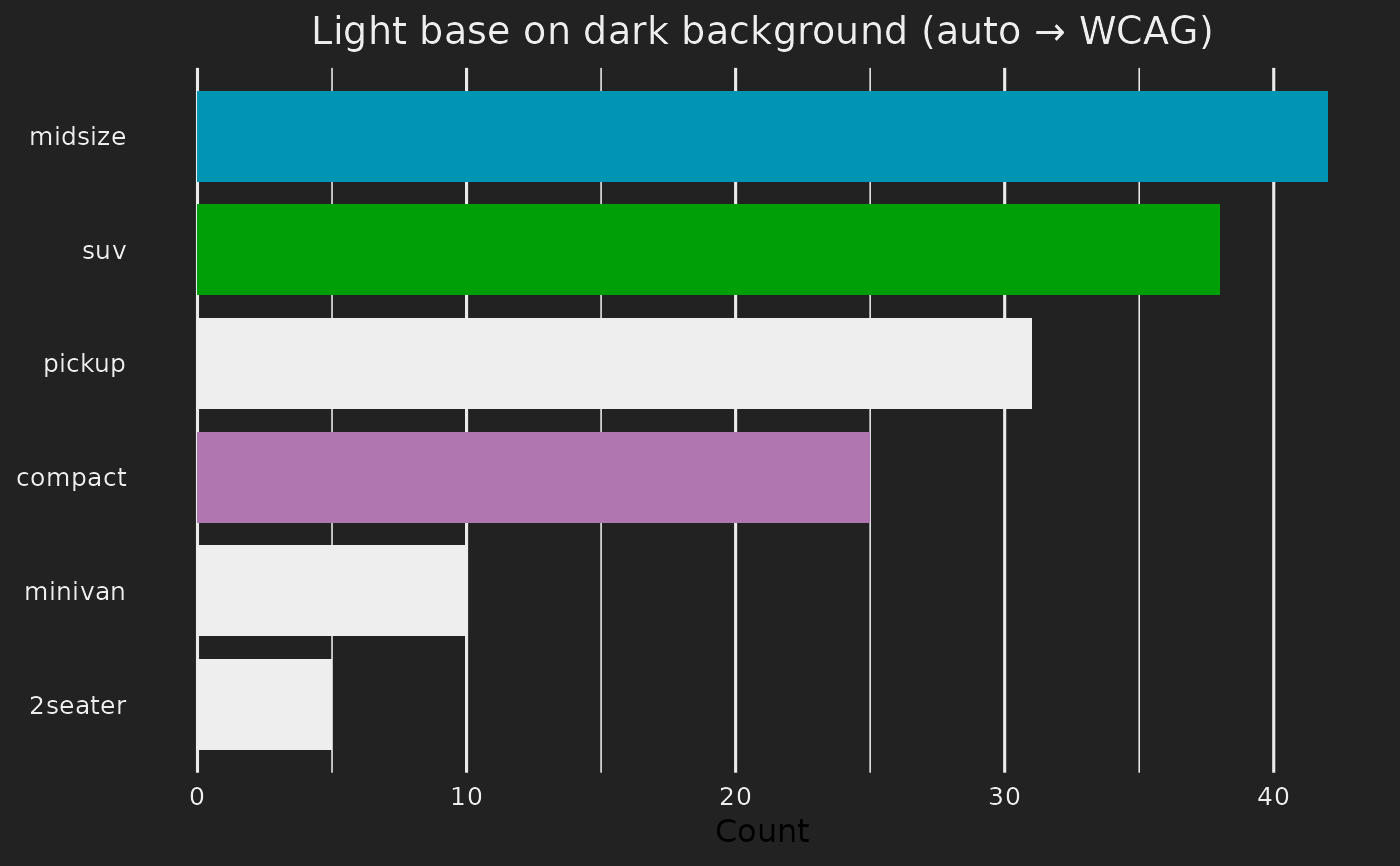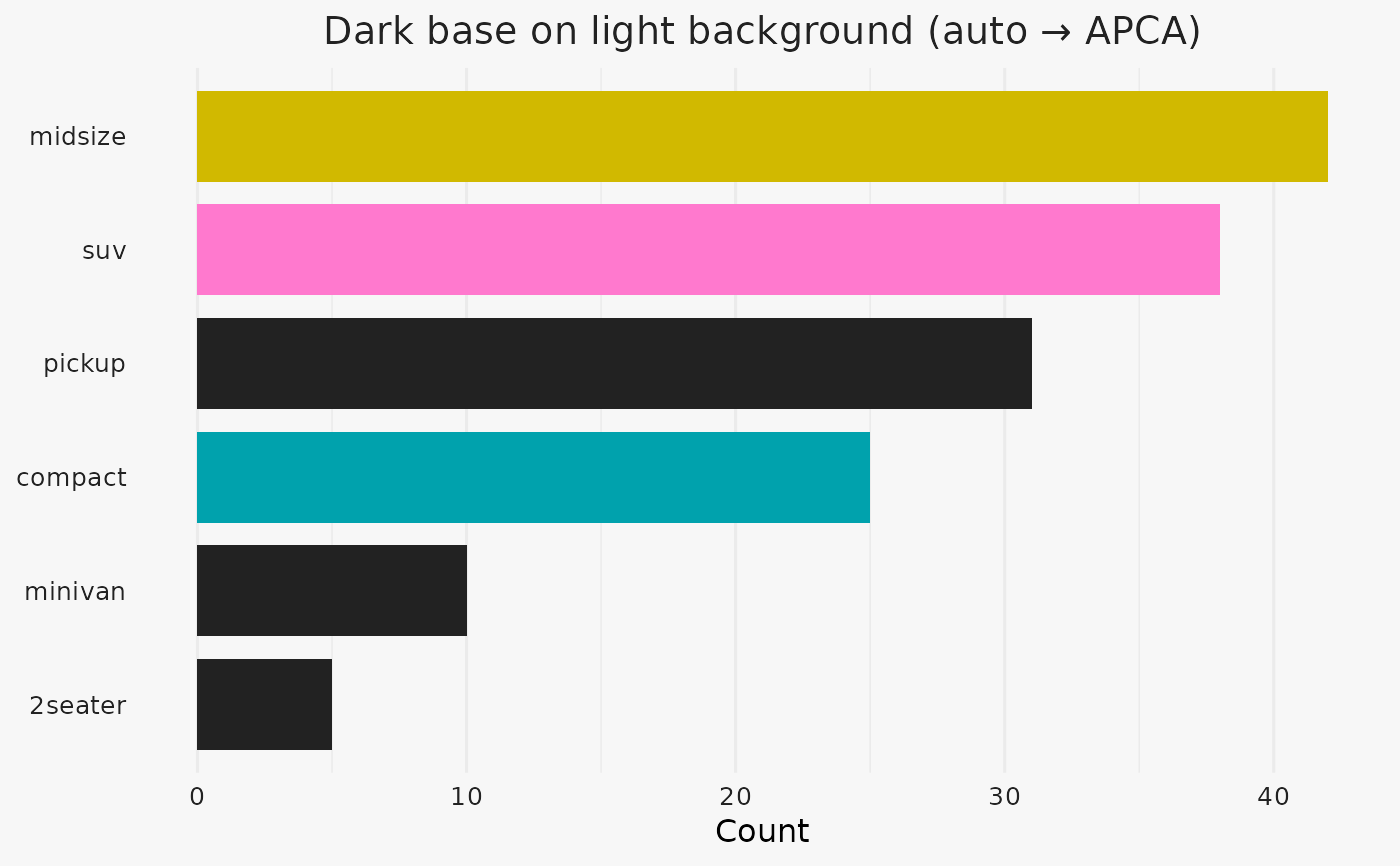 NOTE: Switch contrast backend via: options(ggtwotone.contrast_method = "WCAG") # ratio scale, e.g. 4.5 options(ggtwotone.contrast_method = "APCA") # Lc scale, e.g. 60 OR pass contrast_method="auto" to pick per polarity.